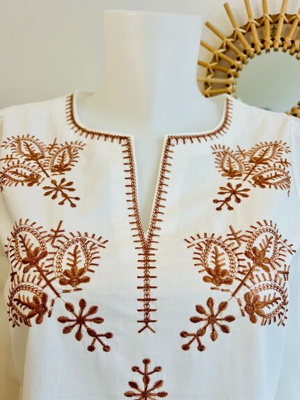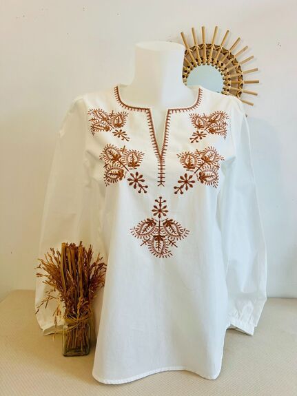 Cette blouse blanche séduit par son raffinement naturel et ses broderies délicates, inspirées de motifs floraux traditionnels.